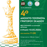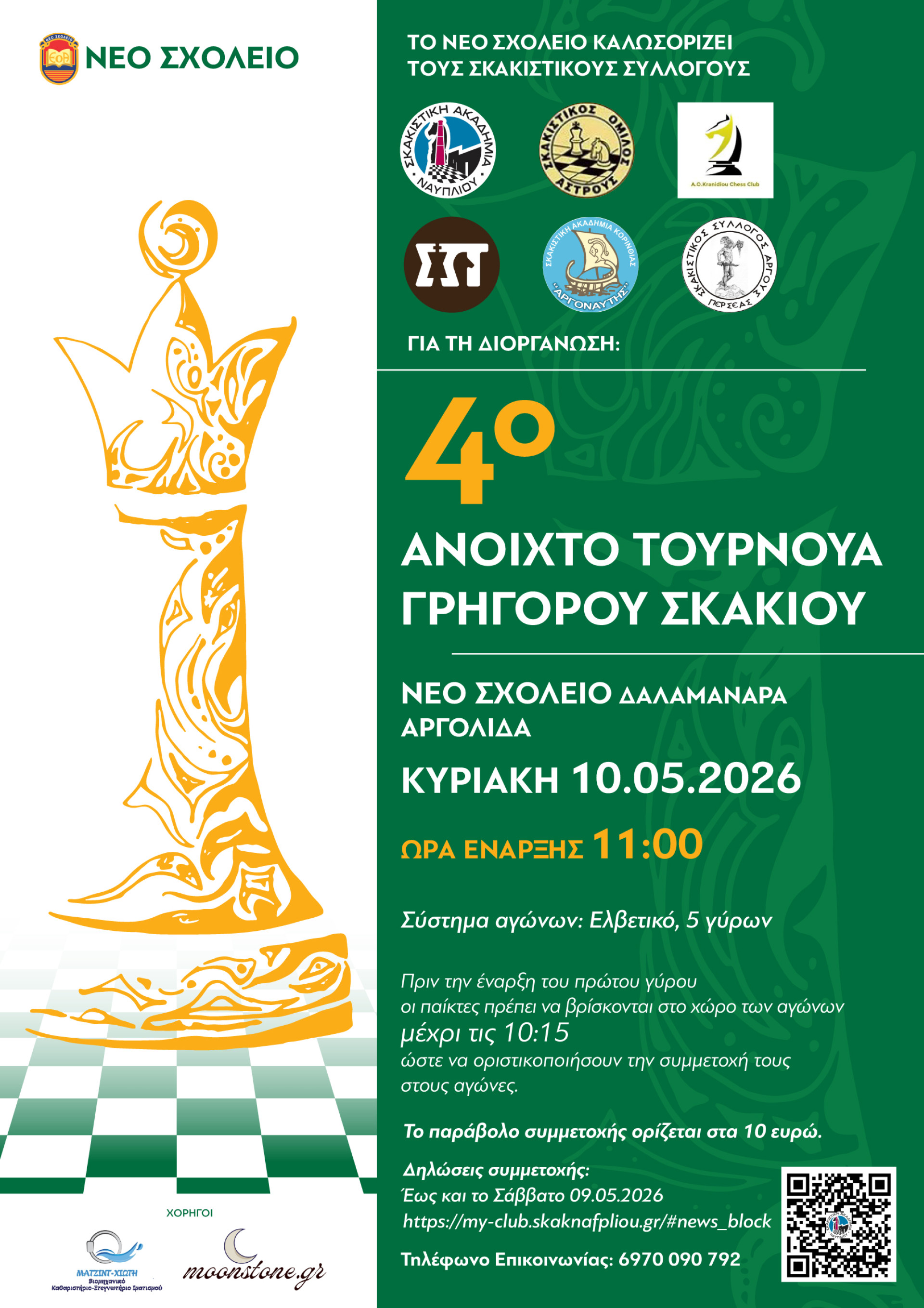 Με ιδιαίτερη χαρά σας προσκαλούμε την Κυριακή 10 Μαΐου 2026 (Γιορτή της Μητέρας), στο Νέο Σχολείο, για τη διεξαγωγή του 4ου Τουρνουά Σκάκι Rapid.