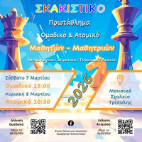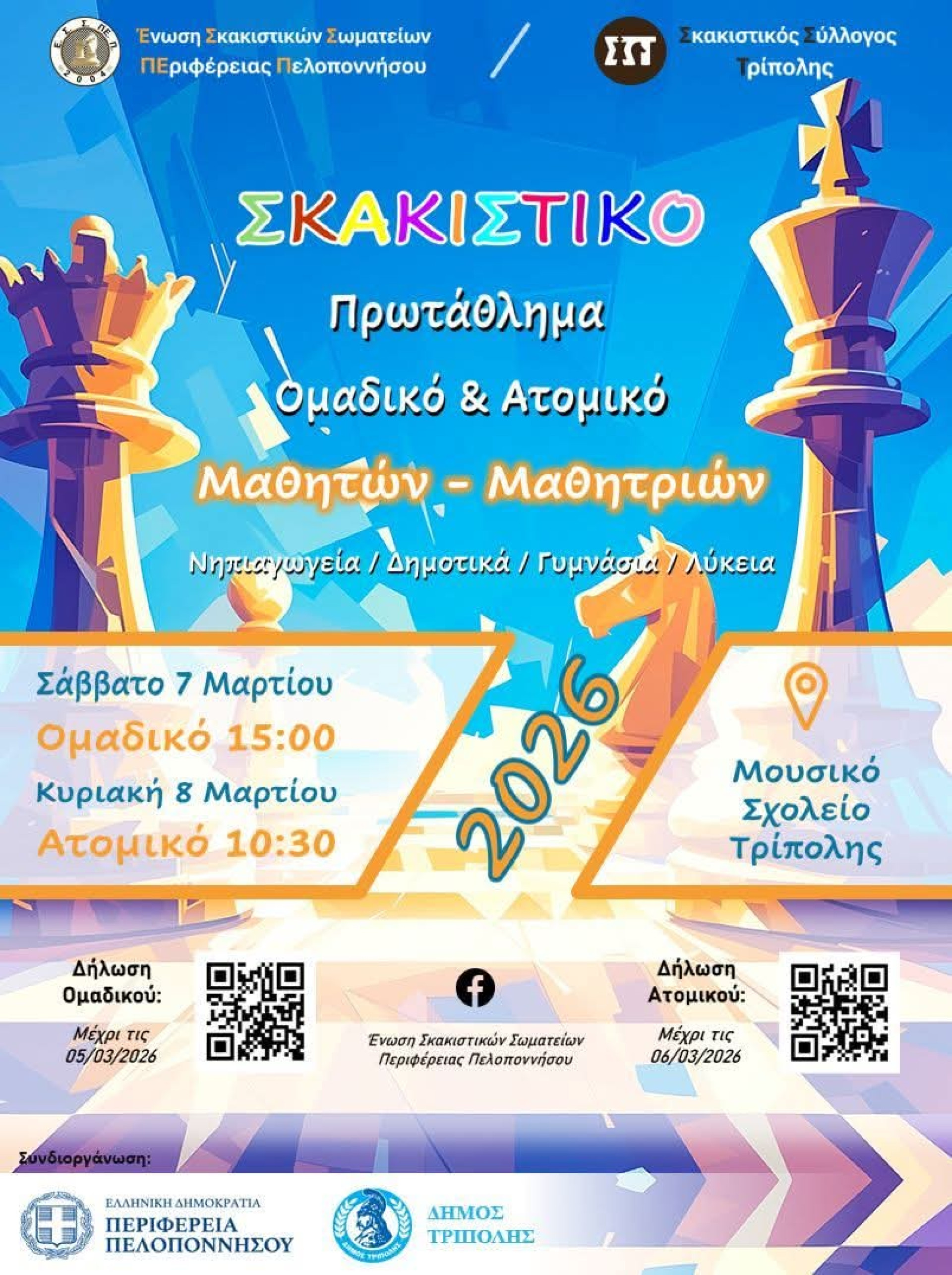 Η Ένωση Σκακιστικών Σωματείων Περιφέρειας Πελοποννήσου προκηρύσσει το Ατομικό και Ομαδικό Πρωτάθλημα Μαθητών-Μαθητριών για το 2026 που θα διεξαχθούν 7 Μαρτίου(ομαδικό) και 8 Μαρτίου (ατομικό) στο Μουσικό Σχολείο Τρίπολης (https://g.co/kgs/b1hiYGo) με συνδιοργανωτή τον Σ.Σ. Τρίπολης, τον Δήμο Τρίπολης και την Περιφέρεια Πελοποννήσου.