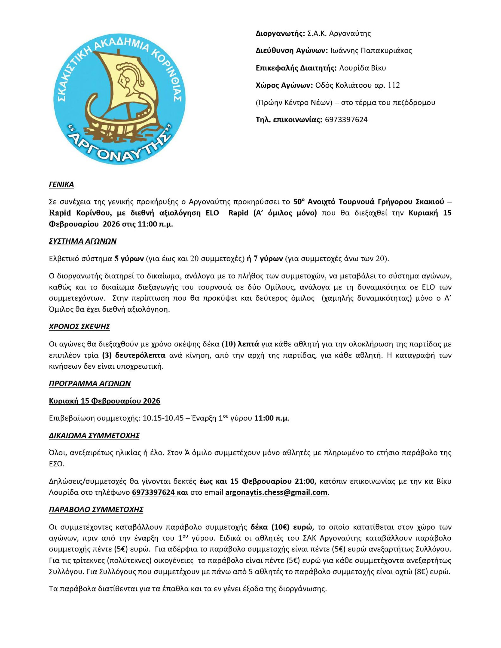 O Αργοναύτης γιορτάζει τα 50 Ράπιντ Τουρνουά..